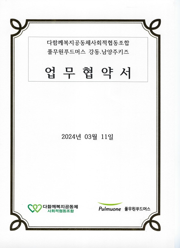 다함께복지공동체 사회적협동조합은 풀무원푸드머스와 업무협약서를 맺음.